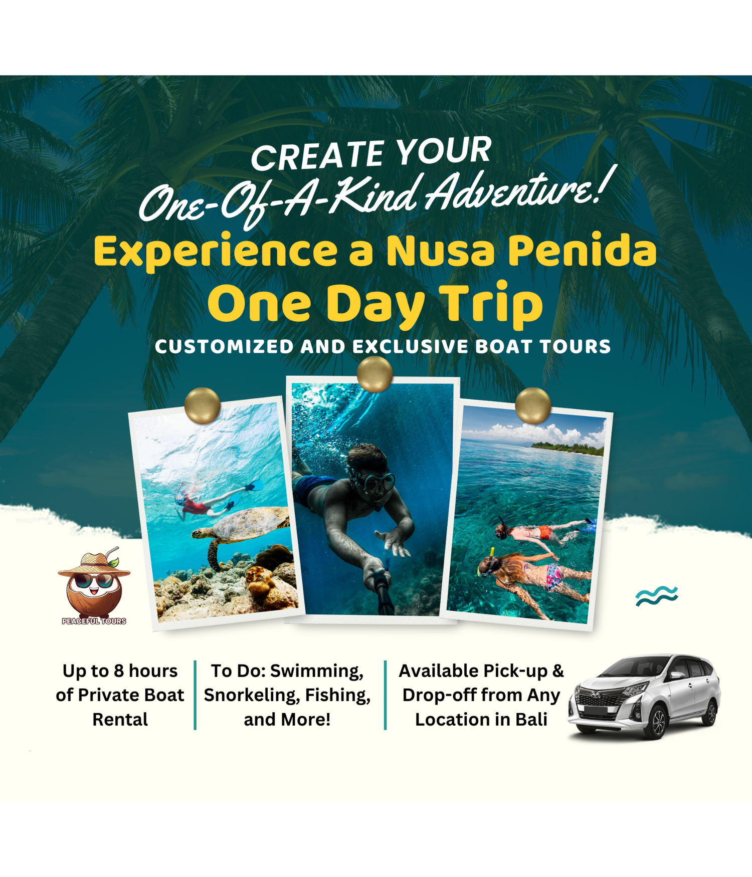 Jelajahi Bali, Nusa Penida, atau Nusa Lembongan melalui paket wisata standar kami atau biarkan kami membuat tur perahu pribadi hanya untuk Anda Anda!